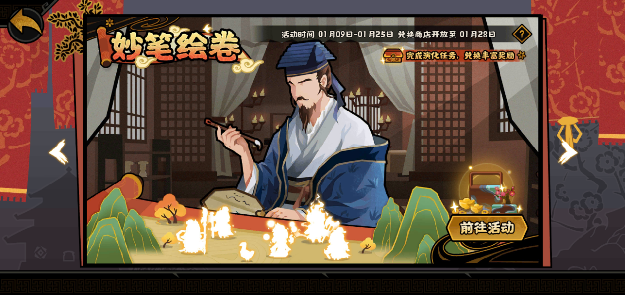 全新一期妙笔绘卷将于1月9日至1月25日开启!(兑换商店开放至1月28日),完成演化任务获取结缘玉佩,即可兑换包括妙级名臣——高长恭、苌弘在内的多重好礼,更有往期天级名臣自选礼包返场,机会难得!