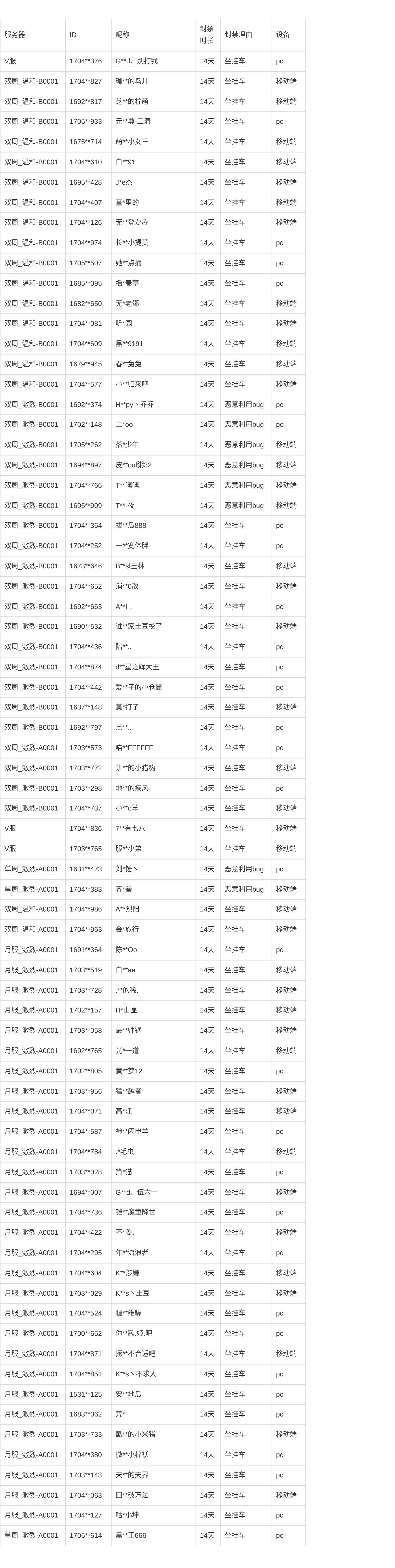 以下为近期因违规处罚情节较重的玩家公示名单,相关角色已进行复核,违规属实。如有任何疑问,请通过游戏内客服进行反馈。