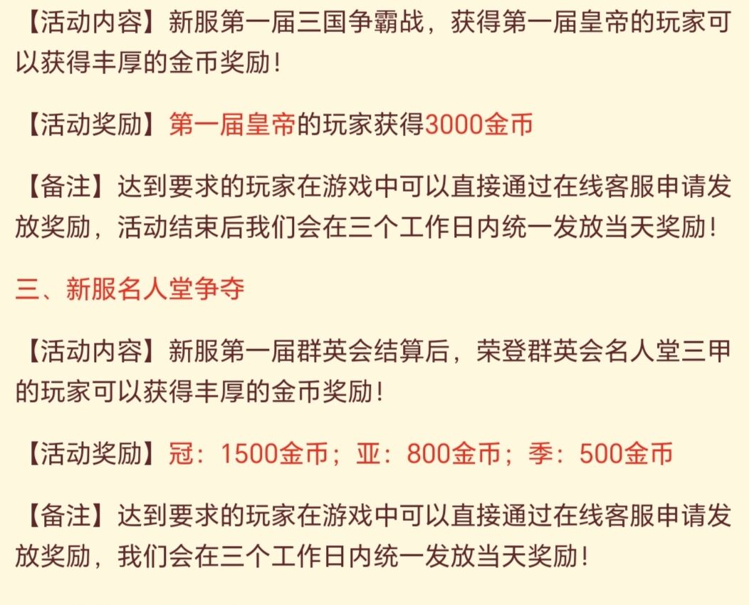 (新区第一任皇帝可以找客服领3000金币,群英会第一:1500金,第二名800金,第三名500金。另外还有军团500金,)多看公告活动。