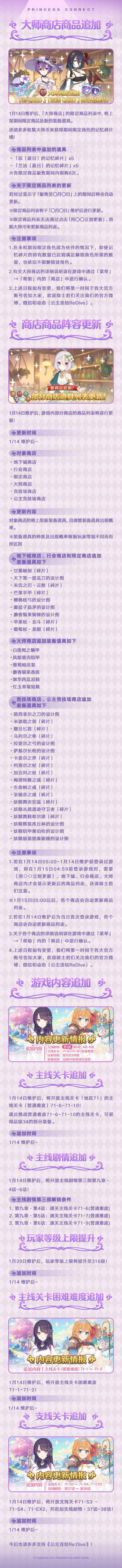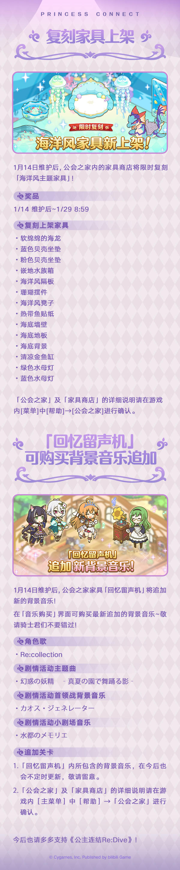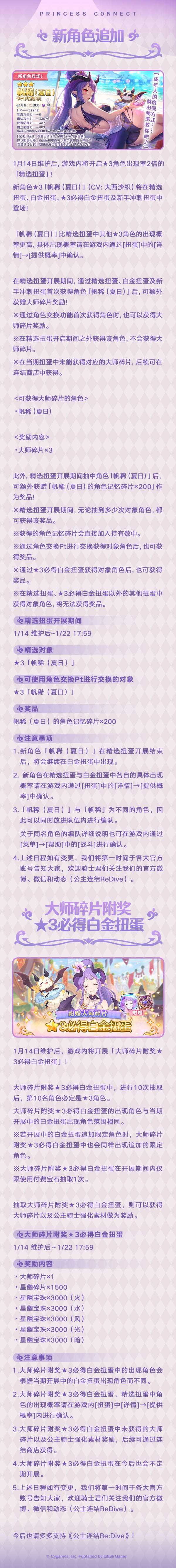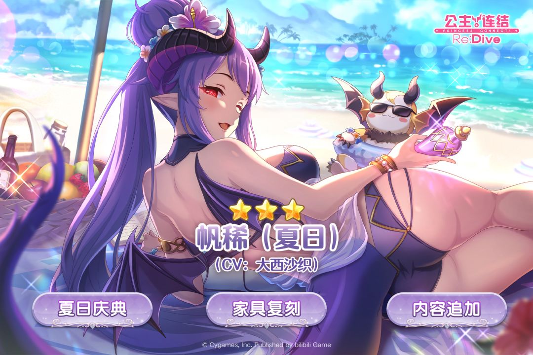维护结束后,游戏内将开启★3角色出现率2倍的「精选扭蛋」,新角色★3「帆稀(夏日)」(CV:大西沙织)将在「精选扭蛋」中登场!同时,还将开展★3必得白金扭蛋;公会之家将限时复刻「海洋风」主题家具;回忆留声机将追加新的背景音乐;大师商店将上架新的商品道具,并追加新的游戏内容!