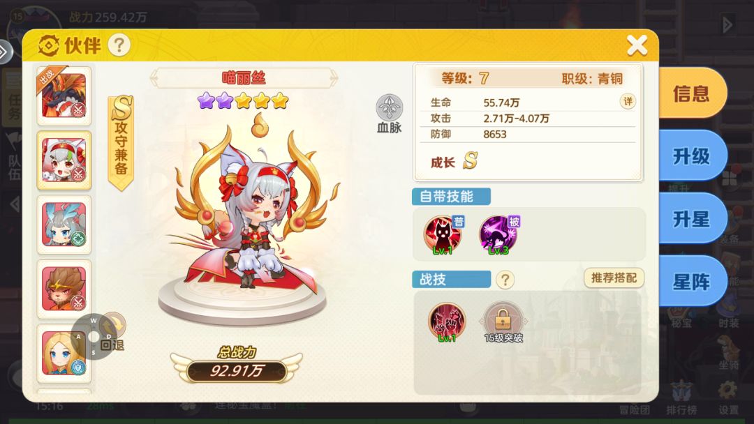 除了升级升星,技能的搭配和加成就是我们伙伴系统最重要的一环了,这里还是以喵丽丝为例。