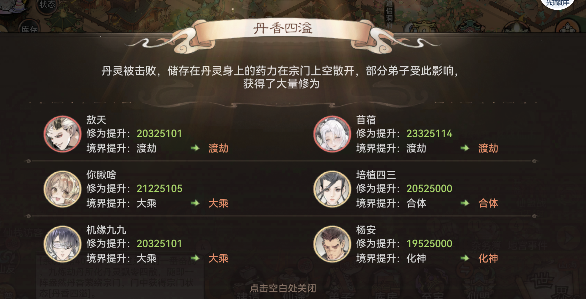 - 灵草:炼丹消耗-领取灵田-取消炼丹,这样可以突破仓库上限,主力五人渡劫圆满后就推荐囤