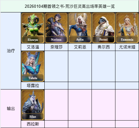 首领之书-荒沙巨灵各期高出场率英雄一览