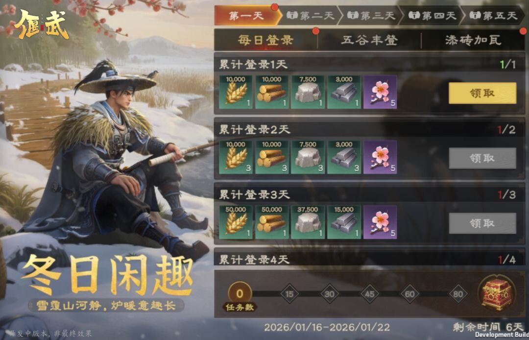 活动期间,前五日每天解锁活动任务,完成即可获得“梅花”和各类资源、政令奖励,同时达成累积进度还能获得名将·百将谱等额外奖励。