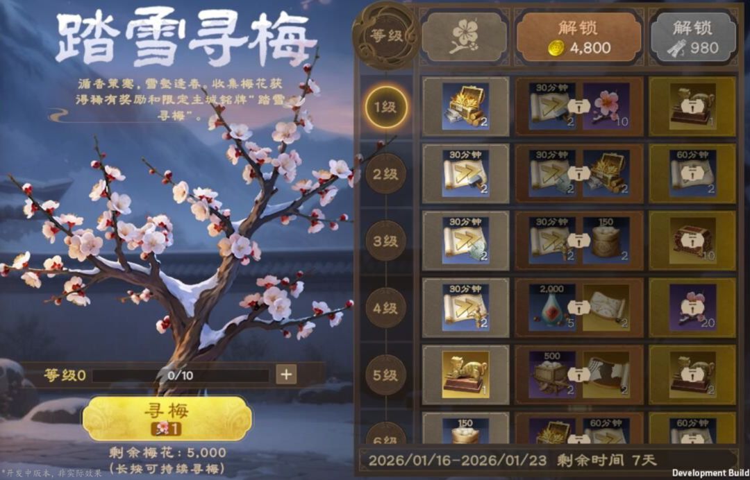 活动期间,在内城收取资源、外城采集或击败叛军,均有概率获得“梅花”,梅花可在踏雪寻梅中使用提升活动等级。