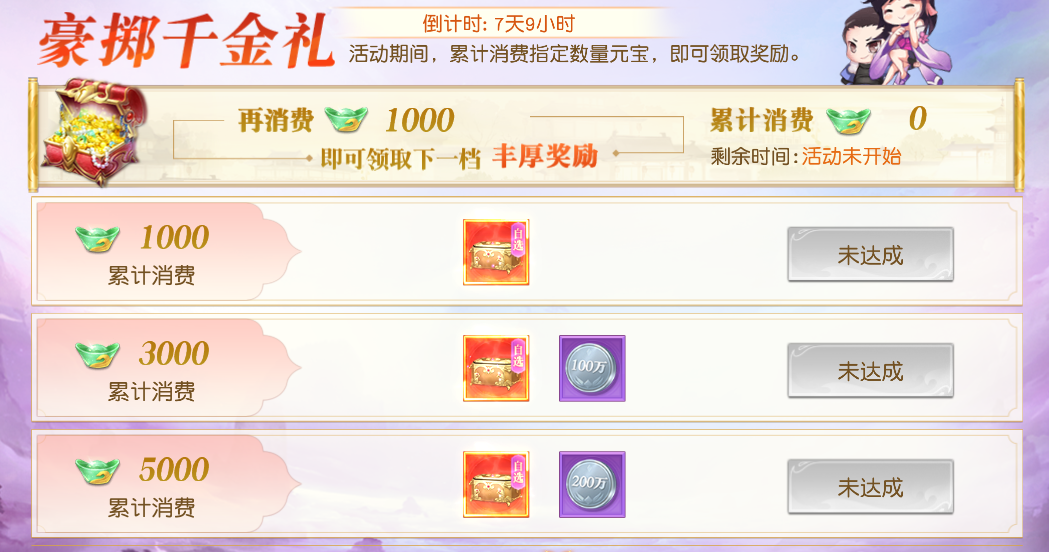 2.累计消费元宝数量达到要求,即可领取对应档位的消费好礼。