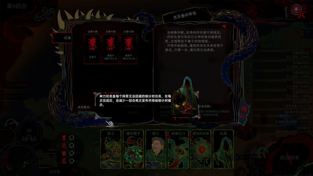 游戏中有着各种任务,主要分为三种,分别是常驻任务、打野任务、神力任务。其中,常驻任务又可以分为神殿常驻任务、教堂常驻任务、祭坛常驻任务等,主要是对应的各个建筑;打野任务包括遗迹考察等;神力任务则是阵营的核心任务,关系到阵营的兴衰。玩家需要再神力倒计时结束之前,派遣使徒去执行执行神力任务。任务失败,或者没有执行任务,都会受到惩罚。三个阵营的神力任务的要求、奖励等都是不相同的,例如,克苏鲁的神力任务是“克苏鲁的审视”,完成之后可以使所有非己方的教堂增加50点污染值;哈斯塔的神力任务是“超凡的艺术品”,完成之后可以得到一个属性强力的怪物。