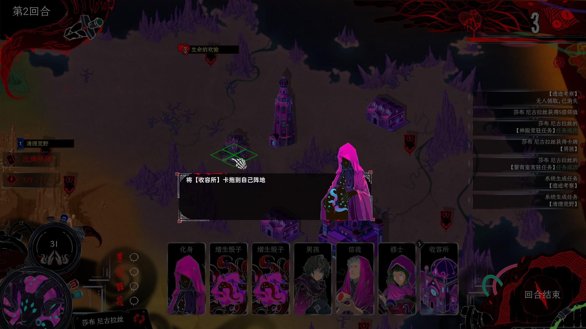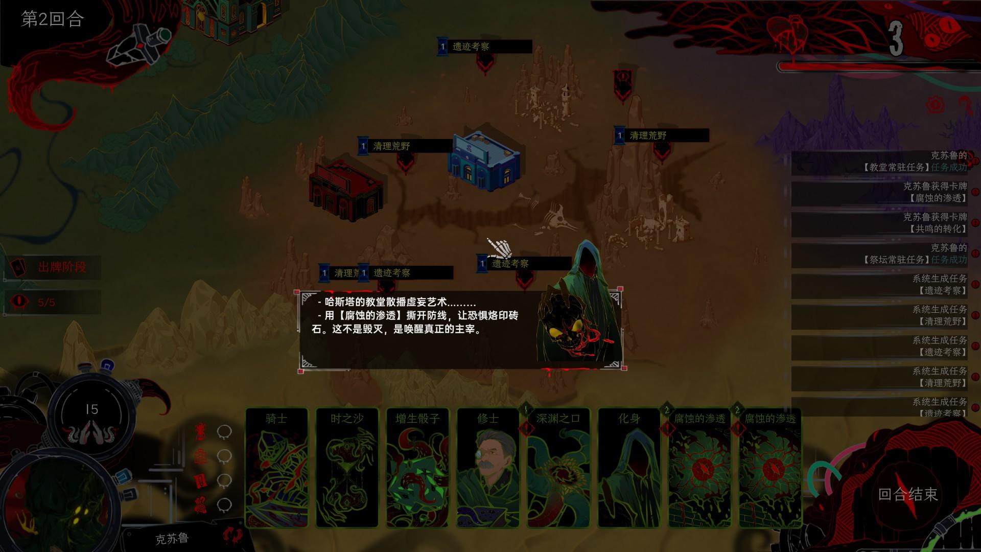 这游戏的目前完成度不高。首先,就是数值平衡度问题,游戏中的克苏鲁阵营严重超标了,一次“克苏鲁的审视”就加所有教堂50点污染点,别人根本来不及针对性地反制,这也让克苏鲁阵营成为无脑胜利的选择。其次,就是教程系统是真的太烂了,基础内容都没讲清楚,非常容易劝退。最后,这游戏是三个阵营互相斗争,应该做成联机的,而不是单机的。