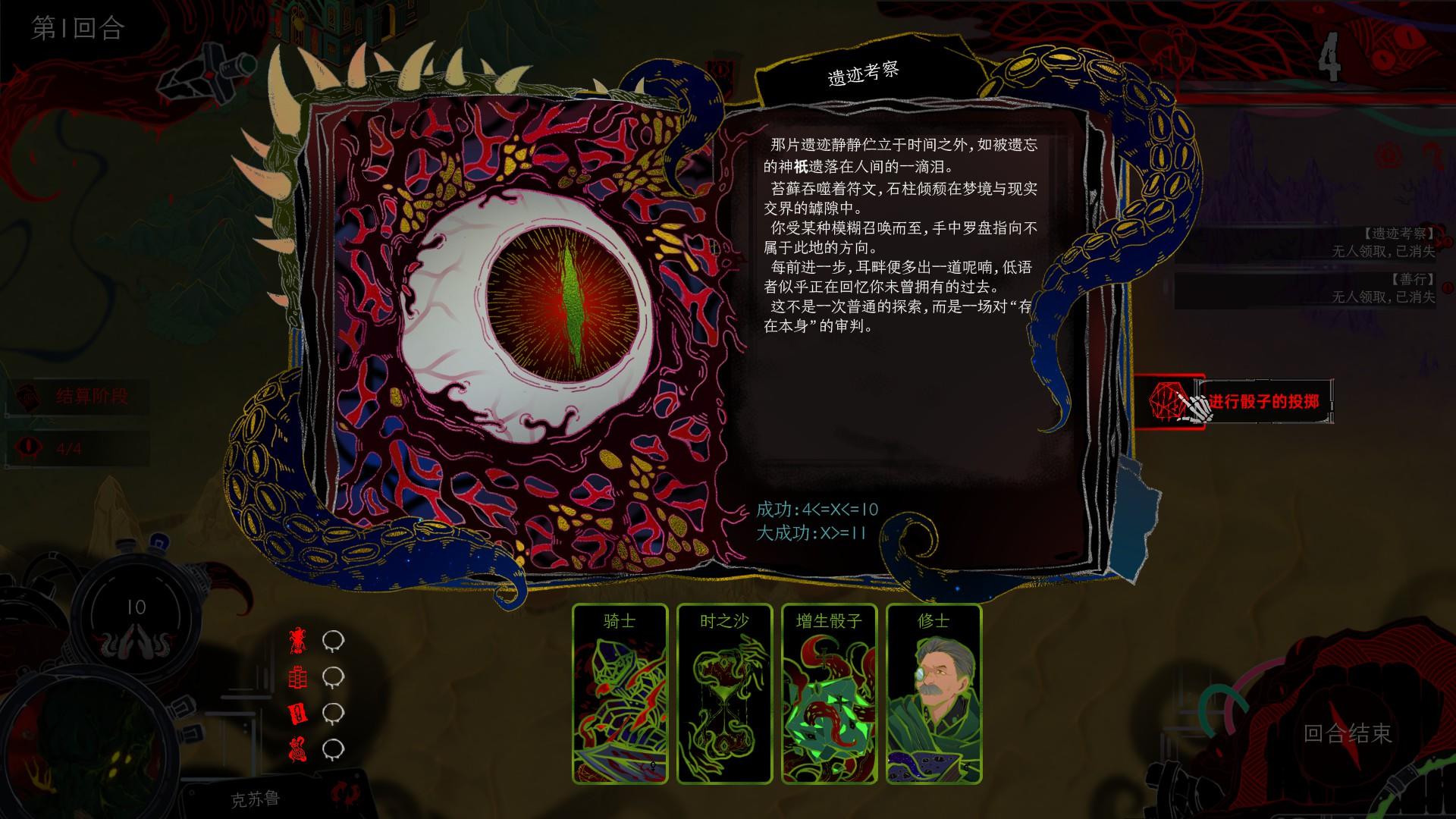 每一个回合结束之后,都要投掷一次骰子。每一个任务都需要独立投骰子,而骰子的点数决定着任务是否成功。例如,教堂常驻这个任务,投骰子必须大于等于4点才能判定成功,大于等于9点才能判定为大成功,才能获得1点天启点。这个设定,无疑是加大了游戏的运气成分。虽然可能让策略爱好者有点不爽,但毕竟克苏鲁的底层逻辑就是混乱,也不是不可以理解。