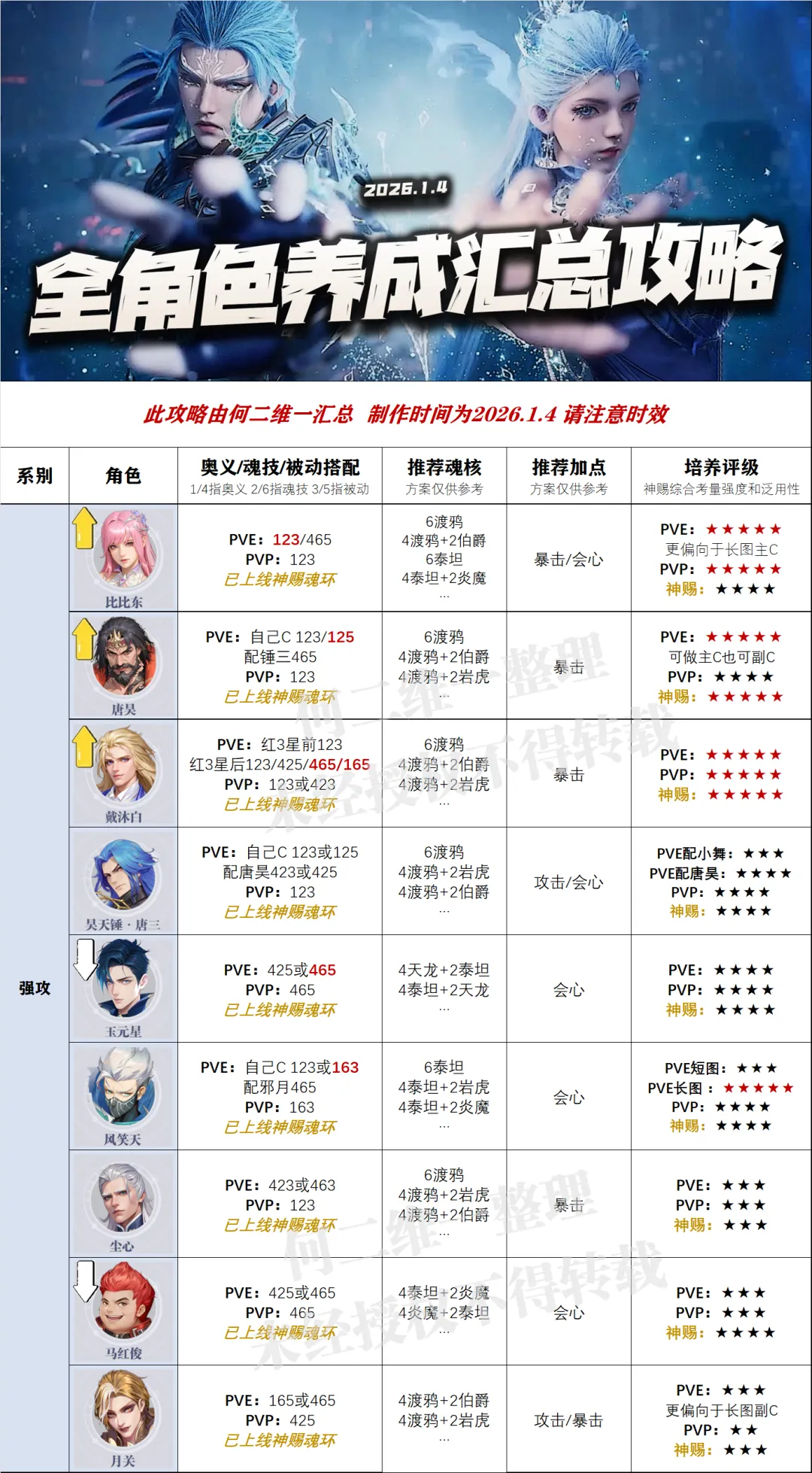 大家好,我是刚刚疯狂打完竞技场的何二维一。今天的攻略我们该来把最新版的全武魂强度评级与养成汇总攻略做个更新了,因为近期随着不少新角色的上线和新神赐魂环的上线,PVE的战斗格局早已出现了较大的变革,同时更大的变革则出现在PVP端,随着PVP新神光翎斗罗和噬魂比比东的上线,最强的PVP主C也随即发生了变化,不过还在维一写这篇攻略的时候便看到了官方于PVP中削弱光翎斗罗和噬魂比比东的公告,真是唏嘘不已,不过因为刚刚晚上才重度打了PVP竞技场,所以维一体感这两位的PVP强度依然在线,只是操作门槛稍微提高了一些,那接着咱们就一个一个开唠!PS:全一图流汇总维一会放到攻略的最后,有需要的朋友可以收藏备用,当然由于汇总的数据过多......如果攻略中有部分出现错误或纰漏之处也欢迎指出,维一会及时进行更新,再次感谢大家的支持。
