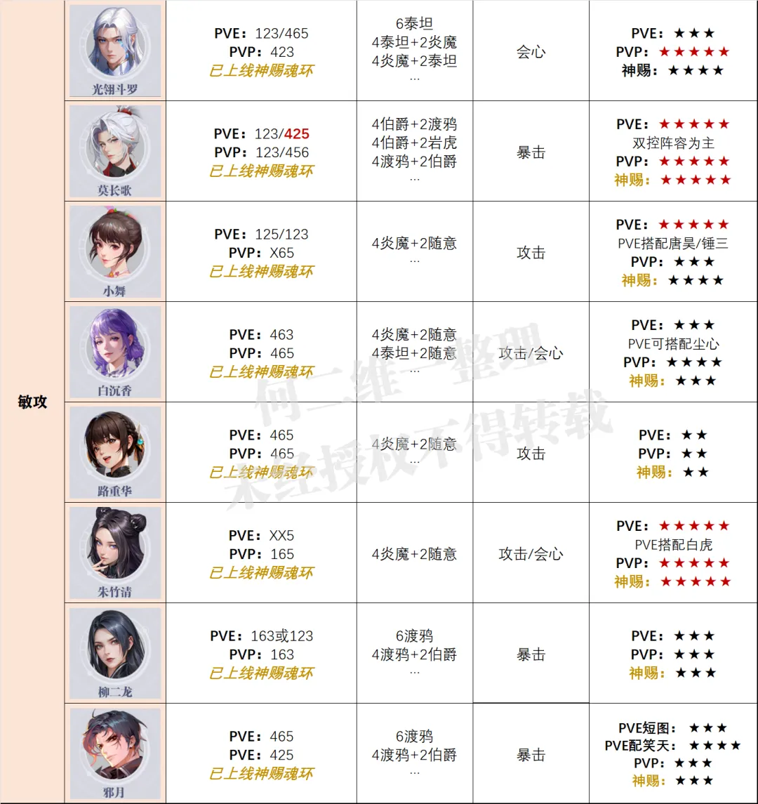 然后在敏攻系部分,此次的变化并不算很大,新加入的光翎斗罗PVE方面就不提了,这些个通行证魂师在PVE方面都不咋样,也算是个一脉相承的传统了,但这三位却在PVP端甚是恐怖,初代目通行证角色白沉香曾霸据PVP敏攻第一宝座长达数月之久,而二代目通行证角色叶原至今也是PVP第一辅助武魂,然后三代目通行证角色光翎斗罗的上线嘛则又一次证明了这个逻辑,其目前就是PVP中最强的敏攻系角色,没有之一,特别是那个还没削弱之前的恐怖核弹模样,不知道大家是否还有印象。接着敏攻系部分最为全面的角色则是莫长歌,PVE端她毫无疑问就是当前主攻敏攻系玩家的首选,PVP端则也有着不俗的发挥,甚至中低段位下还能有些无脑暴力的操作,堪比白虎......