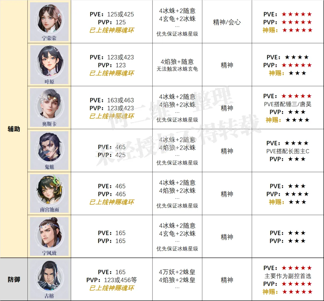 最后的辅助和防御咱们一起说,辅助方面依然是宁荣荣全能,叶原PVP和奥斯卡配唐昊的思路,而防御系方面古榕则依然是六边形战士,几乎所有的战斗场景都有不错的发挥,PVE中则是更多作为副控的首选来上阵,有神赐的前提下优先级非常之高。当然防御系即将上线的第二位限定焱到底能够达到哪种高度,这就得咱们后续再来实测了,哈哈,这里维一便把一图流攻略放到下面,方便大家收藏备用,当然因为汇总的数据太多,如果有任何错误或问题、或者建议的话也欢迎大家私信维一,我后续会进行调整修正的,再次感谢大家的支持。