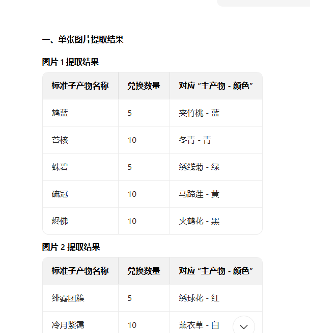 名称修正:若图片中子产物名称为同音 / 近义写法(如 “绎丝”= 绛丝、“绯雾团族”= 绯雾团簇),直接替换为映射表中的标准子产物名称。