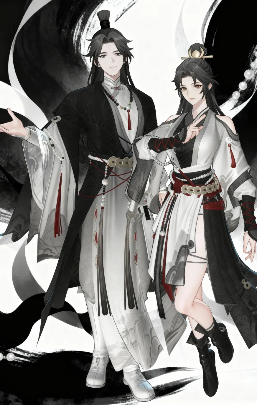 经典水墨风时装,黑、白、灰配色,在腰间、袖口、挂饰上使用朱红色流苏与绳结做跳色。亮点是腰间的红绳铜钱,一看就是行走江湖的修仙儿女。