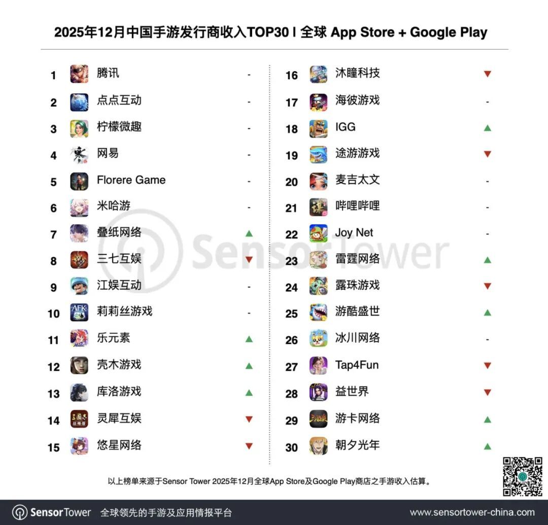 凭借12月初秦彻卡池“银翼安魂地”的推出和月末5.0版本二周年盛典的重磅上线,叠纸网络《恋与深空》再次问鼎全球手游畅销榜冠军,12月收入环比激增122%,创历史最高纪录。Sensor Tower 数据显示,截至12月底《恋与深空》全球收入达9.3亿美元(折合人民币约64.93亿元),预计很快将突破10亿美元大关。该游戏的强劲表现带动叠纸网络本期收入激增90%,跻身收入榜第7名。