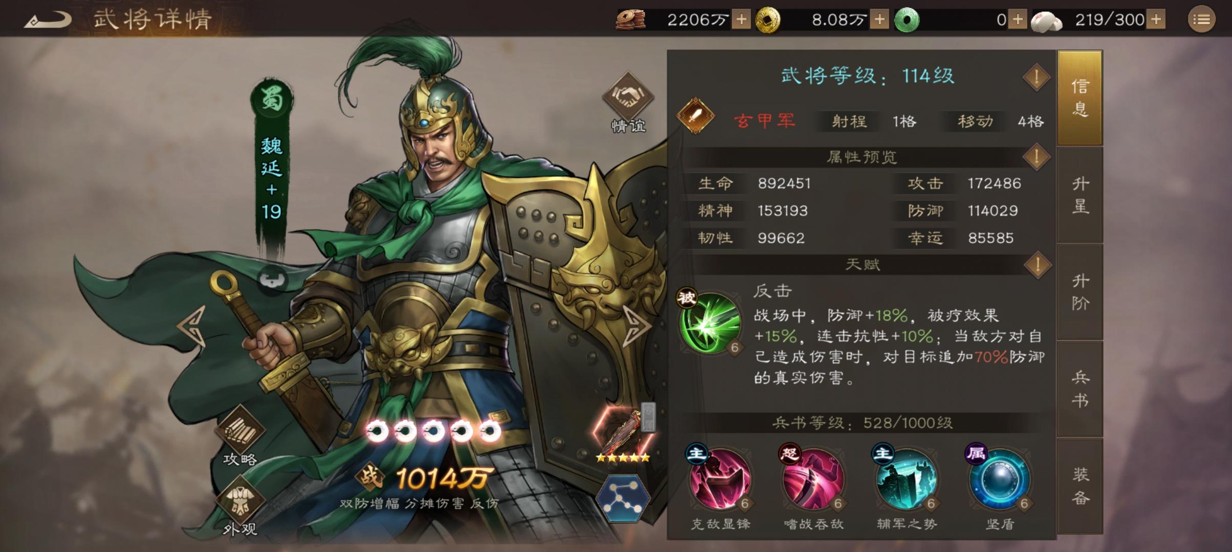 魏延反伤的伤害是70%防御,所以用魏延打输出,就得把最好的装备星符神兵都给他,把防御叠上去