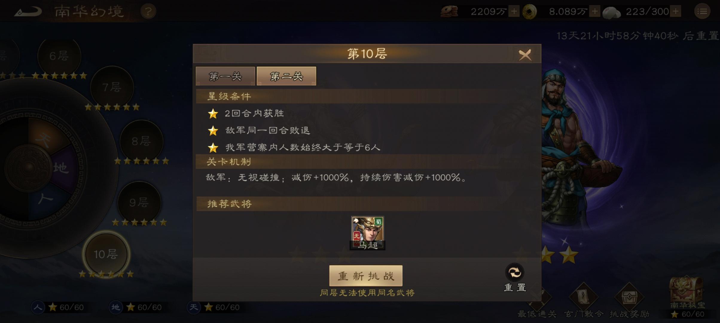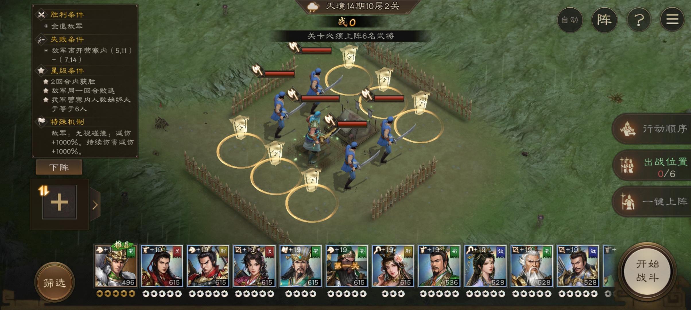 本关敌军拥有高额减伤和穿越移动,开局被围在寨里,敌军ai会向寨外走,一旦逃到外面游戏就会失败,所以我军如果没有马超只能用减速+真实伤害的打法来过关