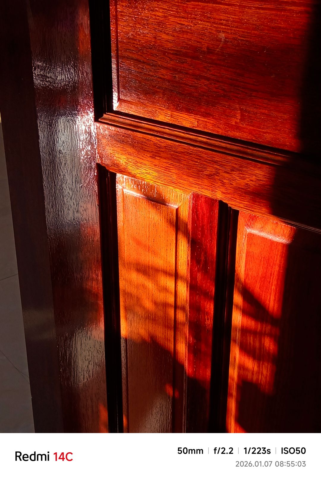红米14C开繁花如梦的滤镜 拍红木门