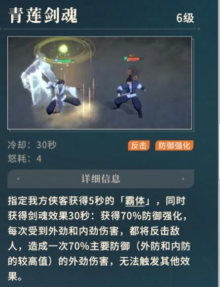 在张凌霄半血回血流中,我们还可以在群攻环境中为其搭配青莲剑魂这张核心策略卡,进一步增强其防御,并且增加一定的输出能力。
