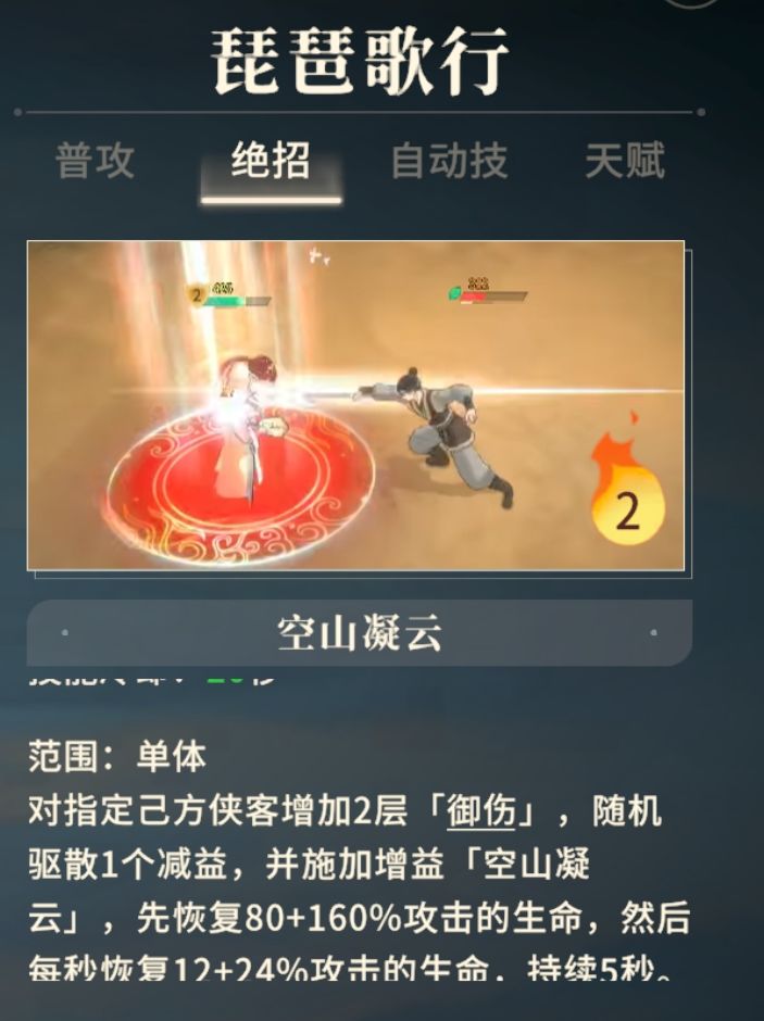 张凌霄的绝招、自动技伤害系数,以及天赋、潜能护盾系数都是和外防正相关,也就意味着是一位堆外防就可以最大化收益的侠客。同时她的潜能和绝招均能给团队提供“化劫”buff,其定位:具有一定团队保护能力的外劲坦克。