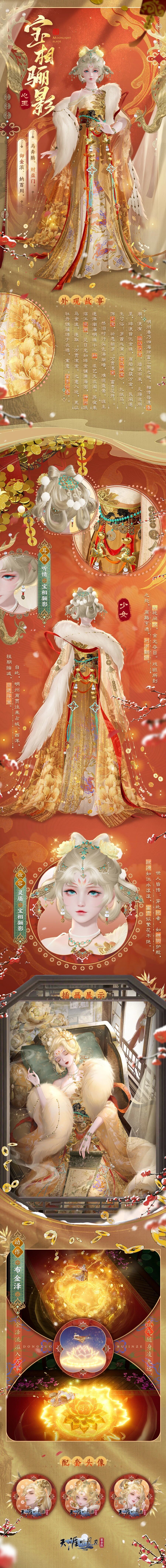 1月8日,全新新年外观【心王·宝相骊影】将随新一期【霓光奇珍】活动来到江湖,收藏外观同步解锁耳饰【听情·宝相骊影】与动作【布金泽】。