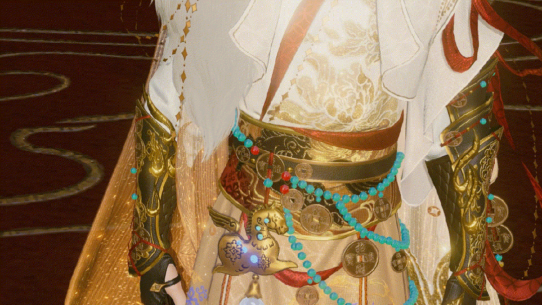 然旧时行头色泽渐暗,难现盛景。班主遂捧南海明珠十二斛,求艺天衣阁。苏夜来临江观潮,见日光如碎金铺满海面,神驹跃马金波,遂取“万贯流金”之意入袍,更以牡丹锦簇绣于衣襟,寓意“富贵长春”。