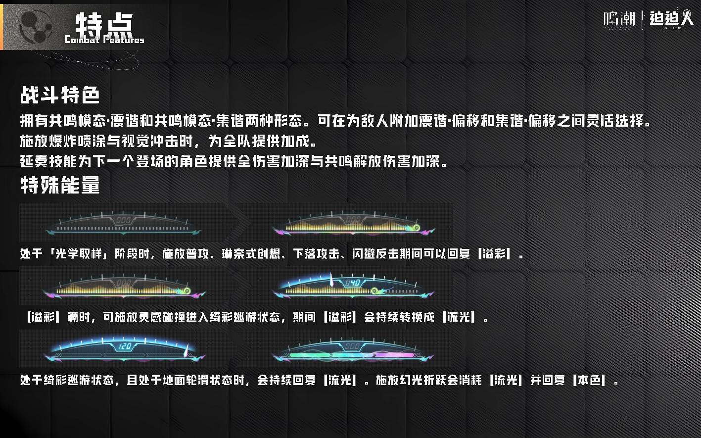 ▲什么是【溢彩】?上限120点,琳奈处于「光学取样」阶段时,只要是施放普攻、琳奈式创想、空中攻击、闪避反击期间就能回复【溢彩】,施放变奏技能时也可以回复【溢彩】。而琳奈的【溢彩】如果满时(满溢彩后普攻图标亮),可以通过按住普攻进入蓄力状态,在蓄力期间,会将【溢彩】转换为【流光】,蓄力期间免疫打断且受到伤害降低50%。【流光】达到120点时,绮彩巡游·普攻第1段和绮彩巡游·普攻第4段的追击能力大幅提升。