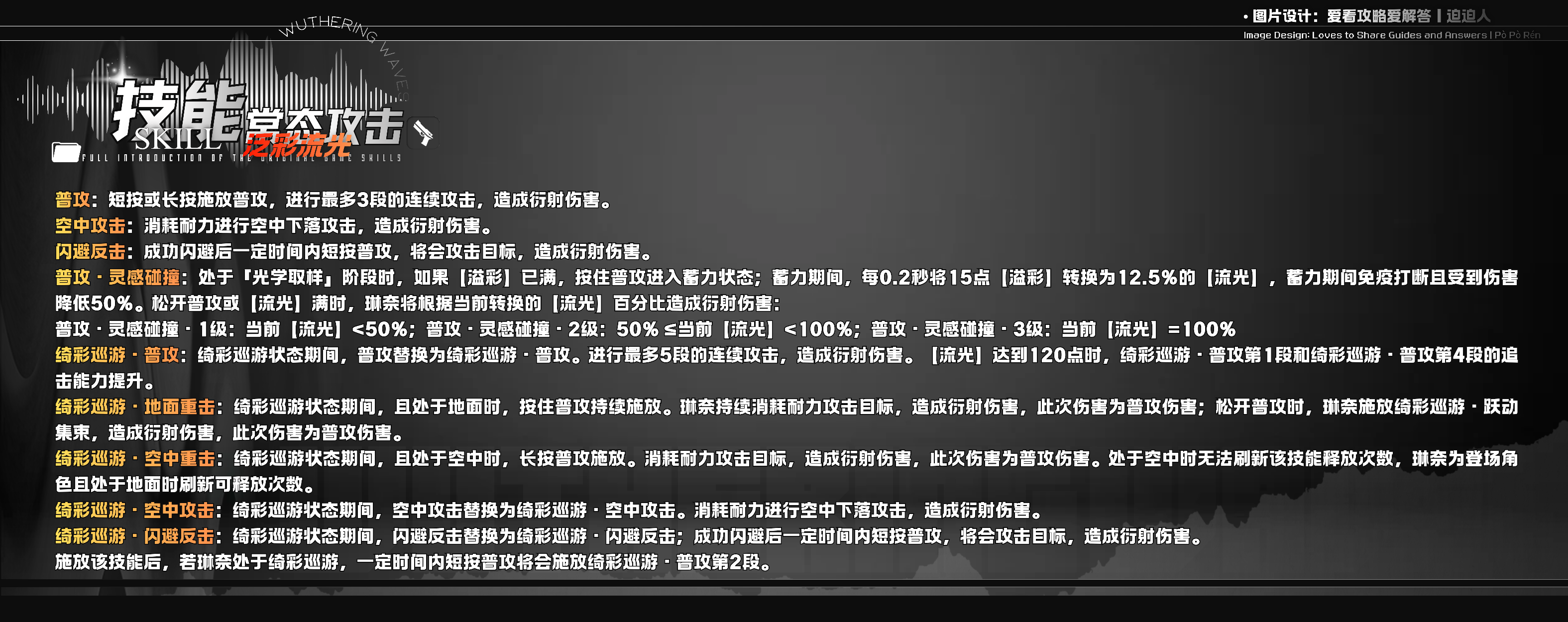 简要整理一下:琳奈在溢彩满120点时,长按普攻触发普攻·灵感碰撞,在松开或溢彩耗尽后会进入绮彩巡游状态。绮彩在巡游状态下时,若琳奈处于地面移动状态或施放特定技能的一定时间内,还会持续回复【流光】。绮彩巡游状态下的资源,移动、普攻、E技积攒攒【流光】,在满40后就能跳起来放【幻光折跃】,最多可连放3次,每放一次得1点【本色】上限是3点。满3点【本色】后空中再按普攻,可释放【视觉冲击】,为命中的目标附加光致变染,并使附近队伍中所有角色的谐度破坏增幅提升40点,持续30秒。
