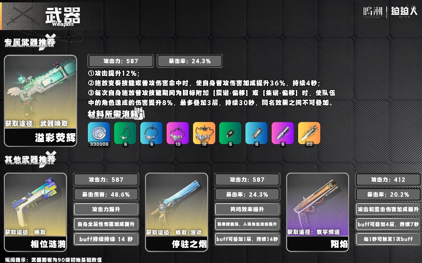 ▪【停驻之烟】:比较补足琳奈的双暴面板,额外共鸣效率加成循环保障更丝滑。▪【阳焰】:四星小专武,一样可以补足双暴面板。