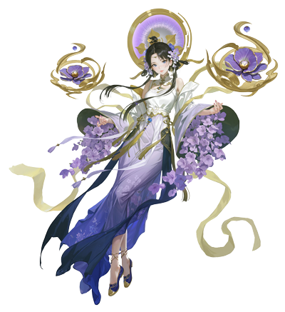 在颜色搭配上,主色调为层次渐变的清雅紫,呼应紫藤兰与兰花的自然色泽,既显柔美亲和,又暗合花神的脱俗气质;基底辅以浅白色,平衡紫色的浓郁感,让整体色调更显通透;点缀金色(丝带、发簪、树叶装饰),既提亮视觉层次,又借金色的精致感强化神性标识,与清雅紫形成柔与贵的和谐搭配,适配花神不张扬却不凡的定位。