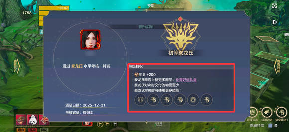 在游戏主界面展开右上角,进入【角色】界面,找到【身份】,便可查看自己的豢龙氏等级、身份权益和考核要求。