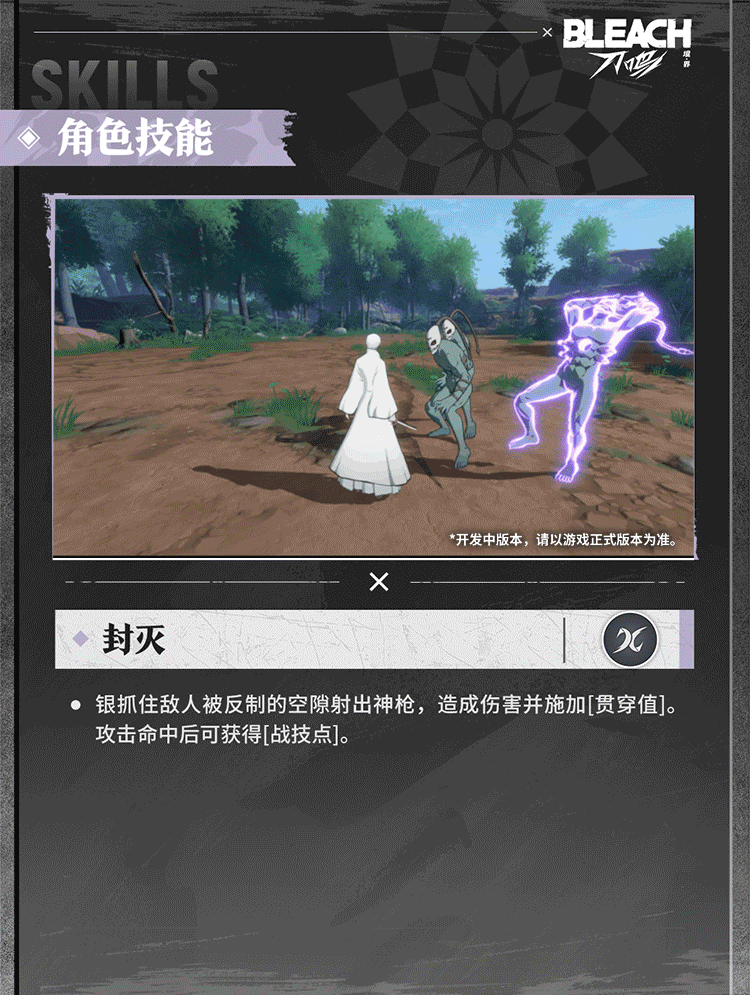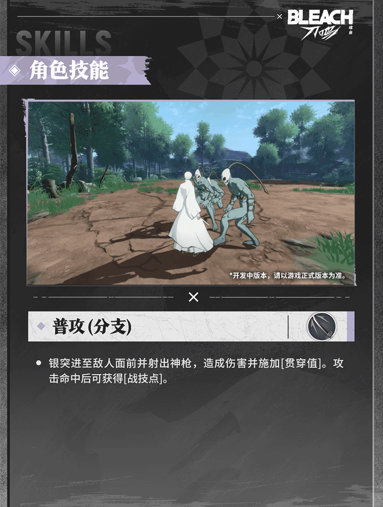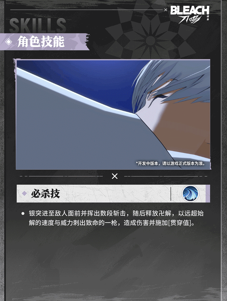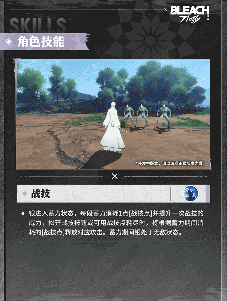 游戏中的市丸银是突系强攻角色,拥有多种连击方式与位移技能控制节奏,积攒灵压可蓄力释放威力强大的战技。点击下方图片,一起查看市丸银的技能详情吧!*研发中版本,不代表游戏最终品质