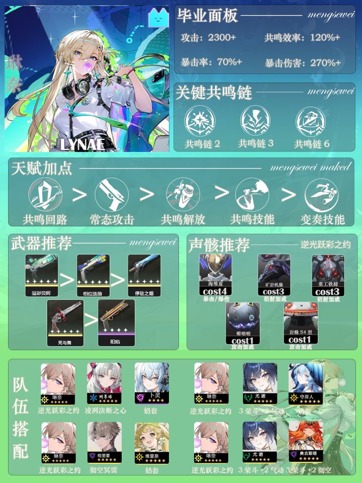 🔸琳奈适用于任何非效应队伍的副C位置,效应队(卡提、赞菲)拐力非常强,成型队伍推荐日月队的3号位 🔸琳奈其实配合嘉贝也不错,抽了嘉贝没仇远 的朋友试试这个,输出基本持平嘉仇。 第二配队为小土豆的冰队,可以给折枝下岗了(笑)。提供种思路,怎么开心怎么来。 🔸核心共鸣连2/3/6,人话:2链强化辅助能力,3链提高琳奈伤害,6链琳奈可以当主C玩