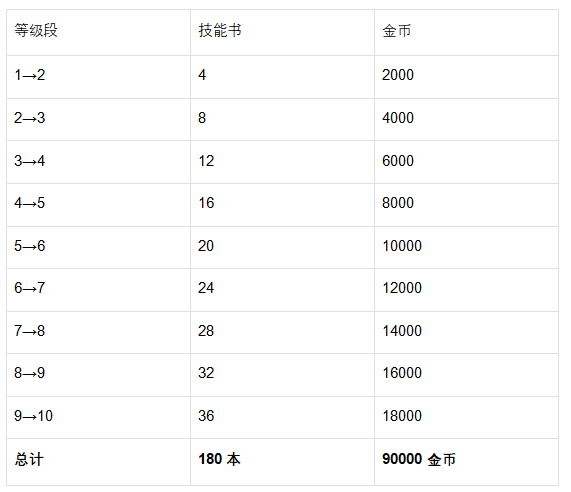 二、升级所需资源(单条技能线)