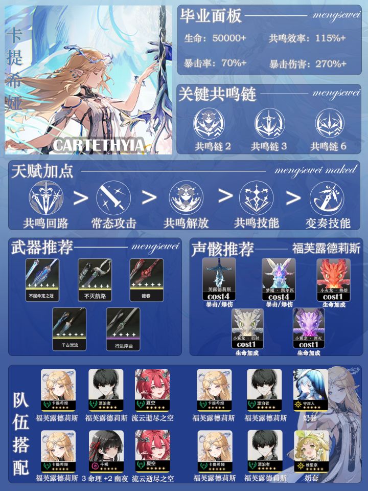 各位早上好、中午好、晚上好,这里是檬涩,惯例为大家带来角色复刻攻略 卡提希娅:推荐主要声骸福芙露德莉斯(大剑)cost4 选择愿戴荣光之旅套装, 毕业:44111,主词条cost4选择双爆、cost1选择百分比生命 无夏空推荐43311,cost3选择气动加成,其他不变 副词条优先选双爆>生命>共鸣解放≈普攻≈共鸣效率
