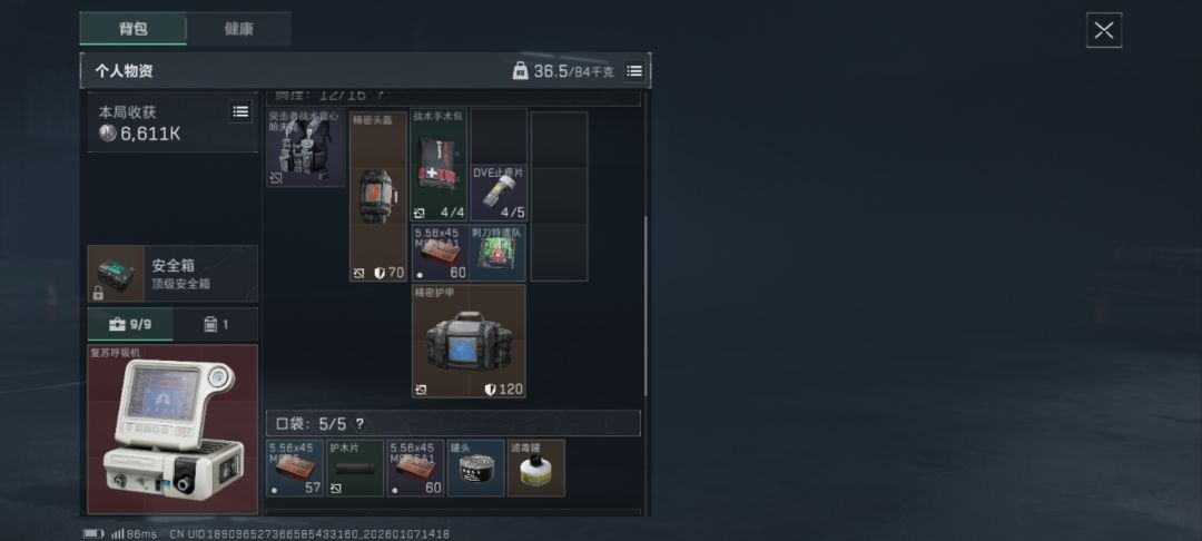 武器箱没东西,医疗物资堆出了复苏呼吸机,如图5所示,这局我带了橙甲修,橙头修,四弹,想打一下的,但现在这些只能外放了,我必须比平时更稳。