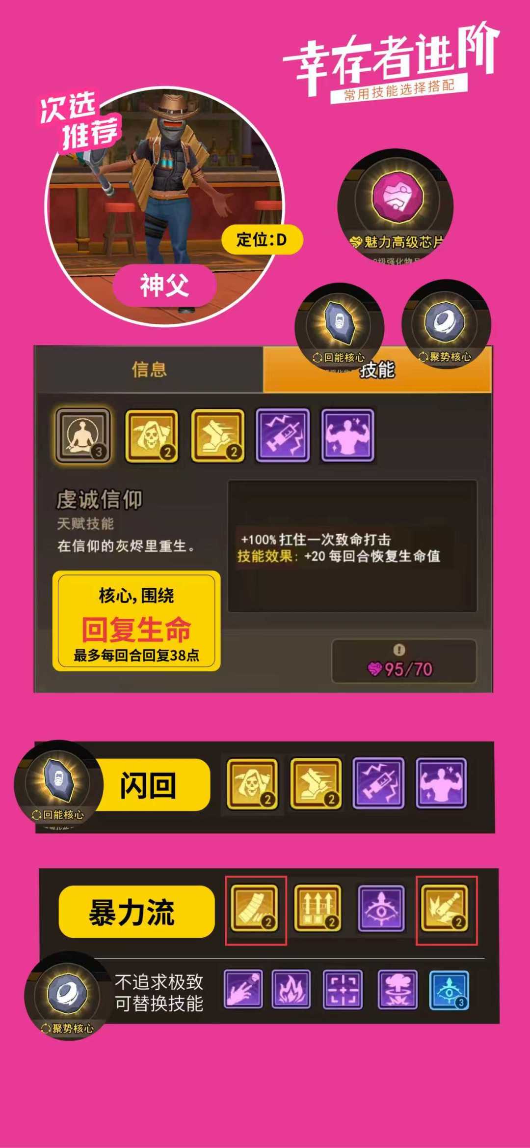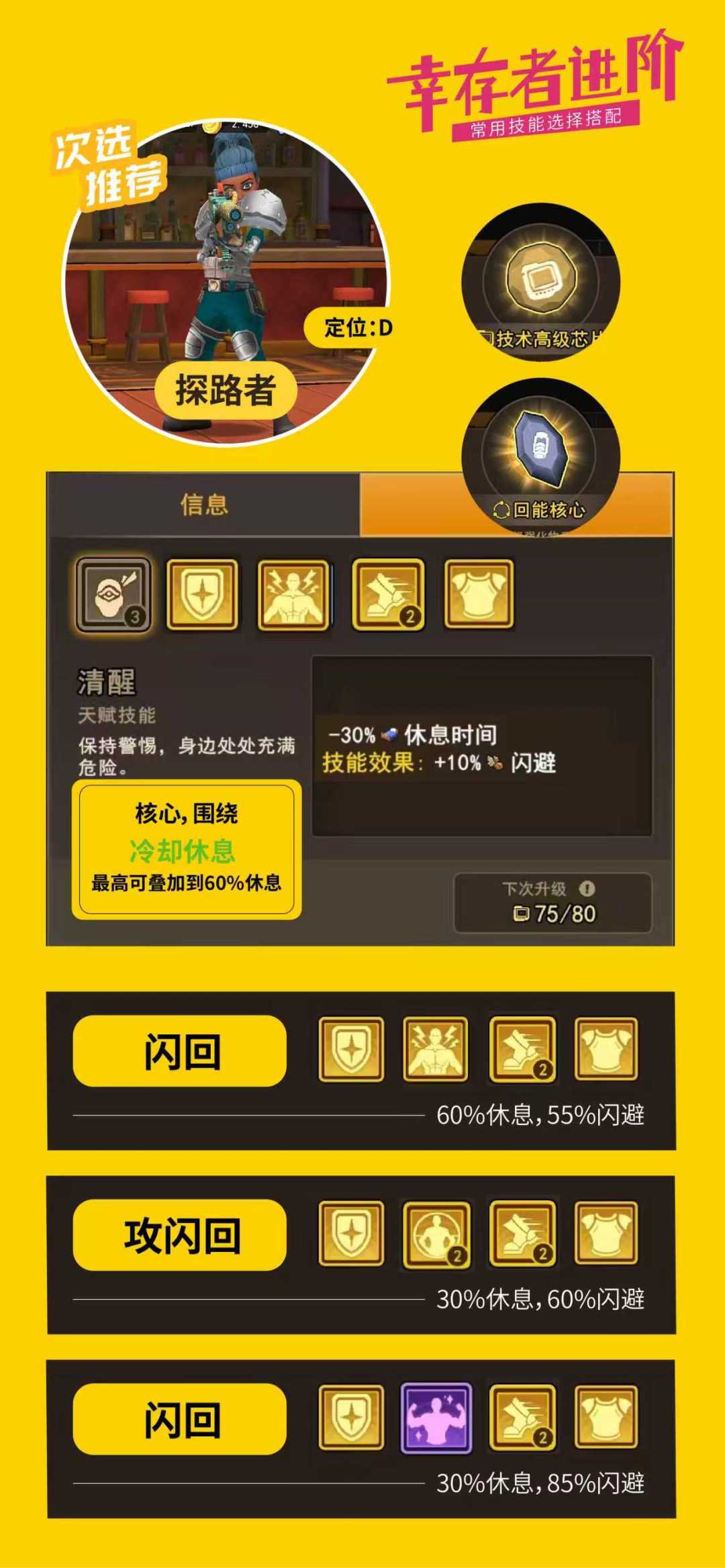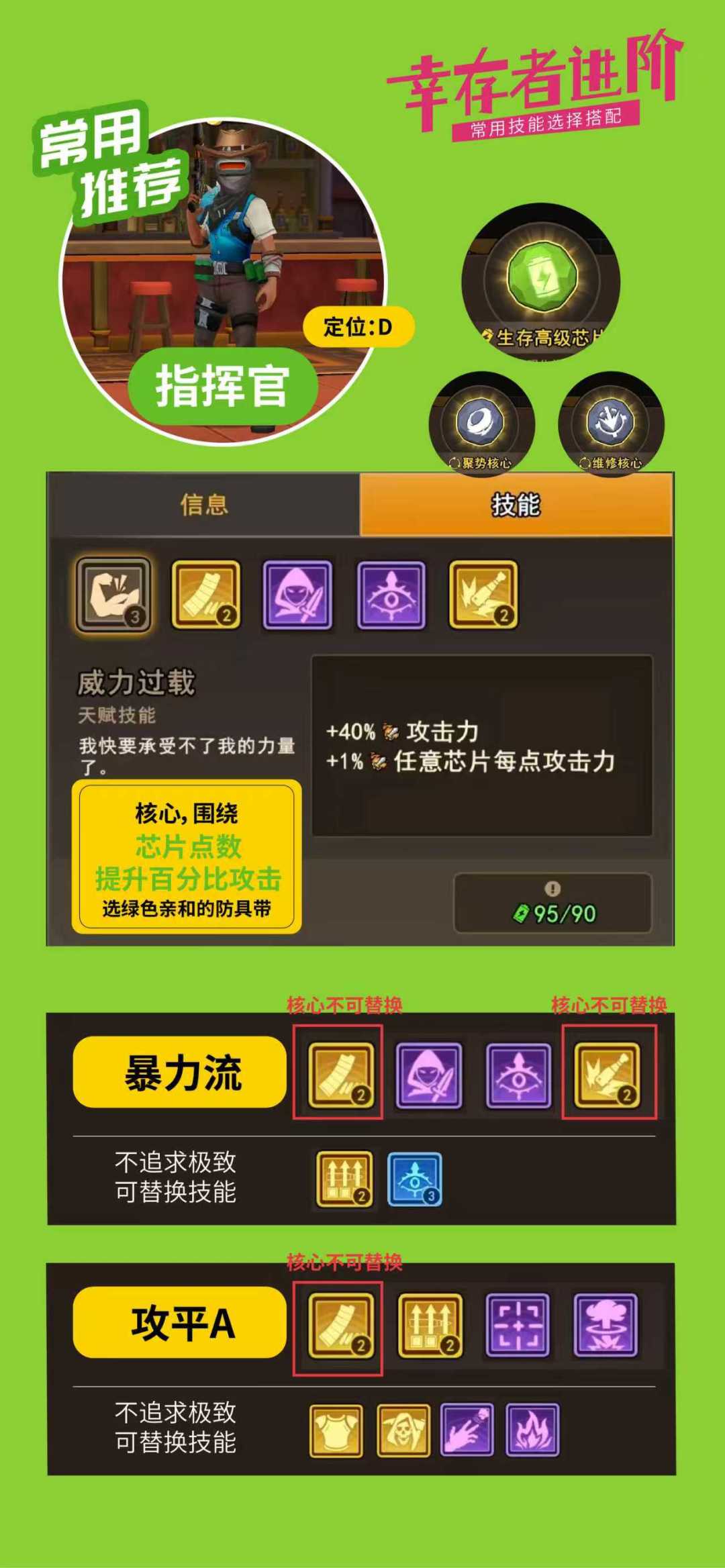 后面是配置了6个种类芯片以及每个种类芯片个人推荐的幸存者,标注了我认为有用的技能包括部分替代技能,希望能更好的帮助大家