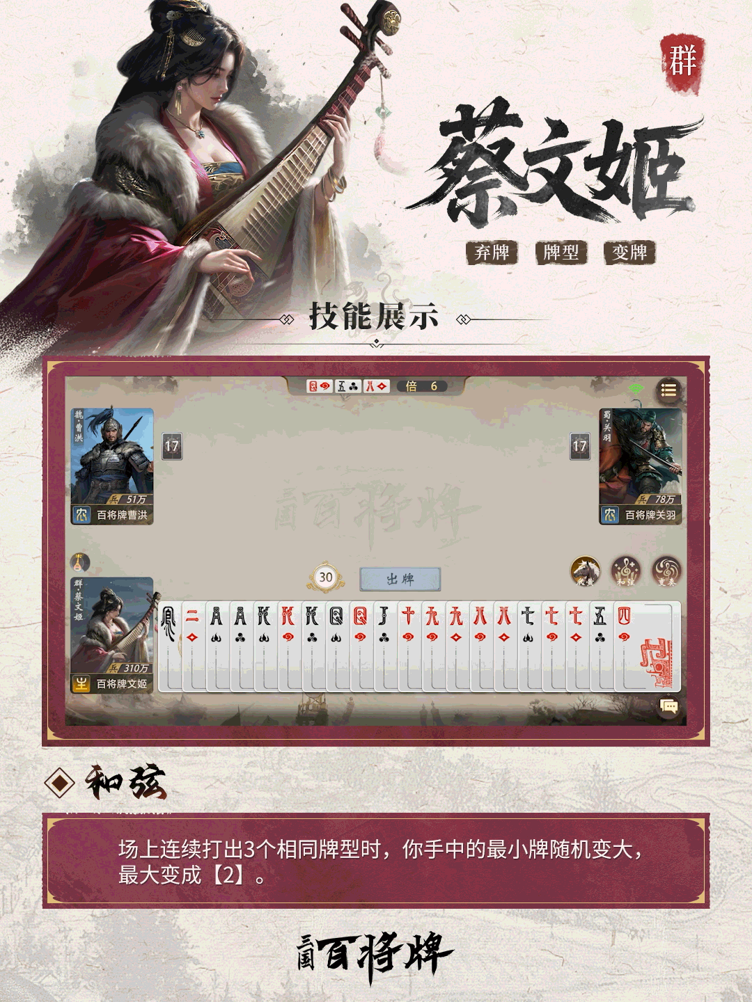 当场上连续打出三次相同牌型时,蔡文姬自动触发【和弦】技能,将自身手牌中的最小牌随机变大;