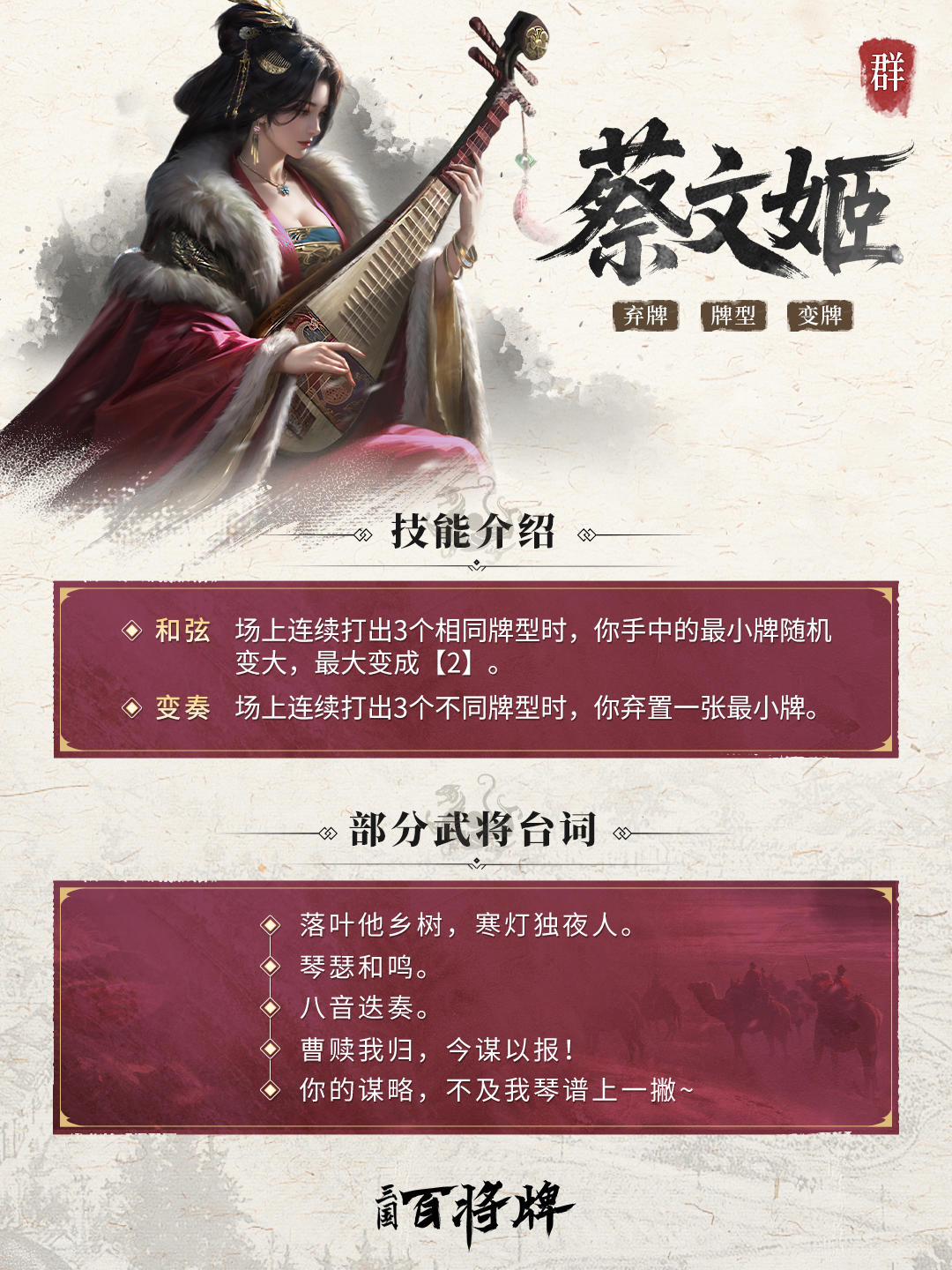◆技能简介:在《三国:百将牌》中,蔡文姬是一位出牌灵活的节奏型武将。她将根据场上连续出牌牌型,弹奏不同“音律”: