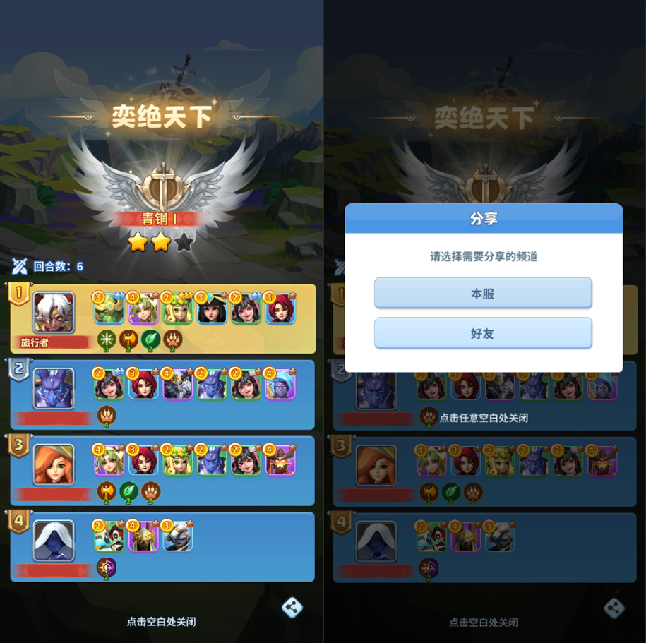 1、优化操作交互方式:点击挑战进入界面选择【点击任意空白处】修改为回到布阵界面