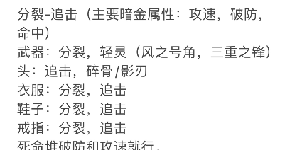 以上分裂-裂创/破阵-轻灵属于是必做,优先级 裂创是最高的,分追要做是因为符文在下界的时候已经半成,分追能爬塔好成型,所以分追能做,但是分裂-裂创才是优先级最高的,如果单套分裂小毕业 基本可以打通20层无尽之塔,遇到特殊怪 巫师 梦魇 水晶 轻看清楚Boss属性再打,以上3套基本能助各位过20层。