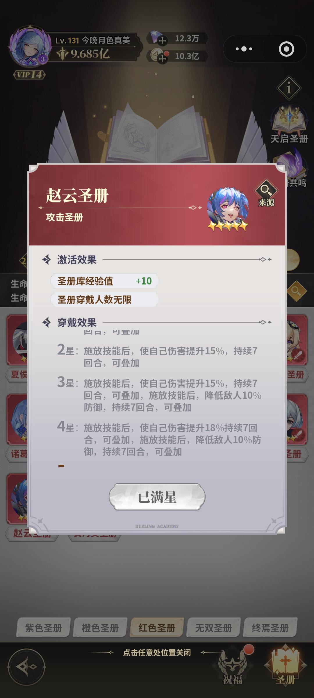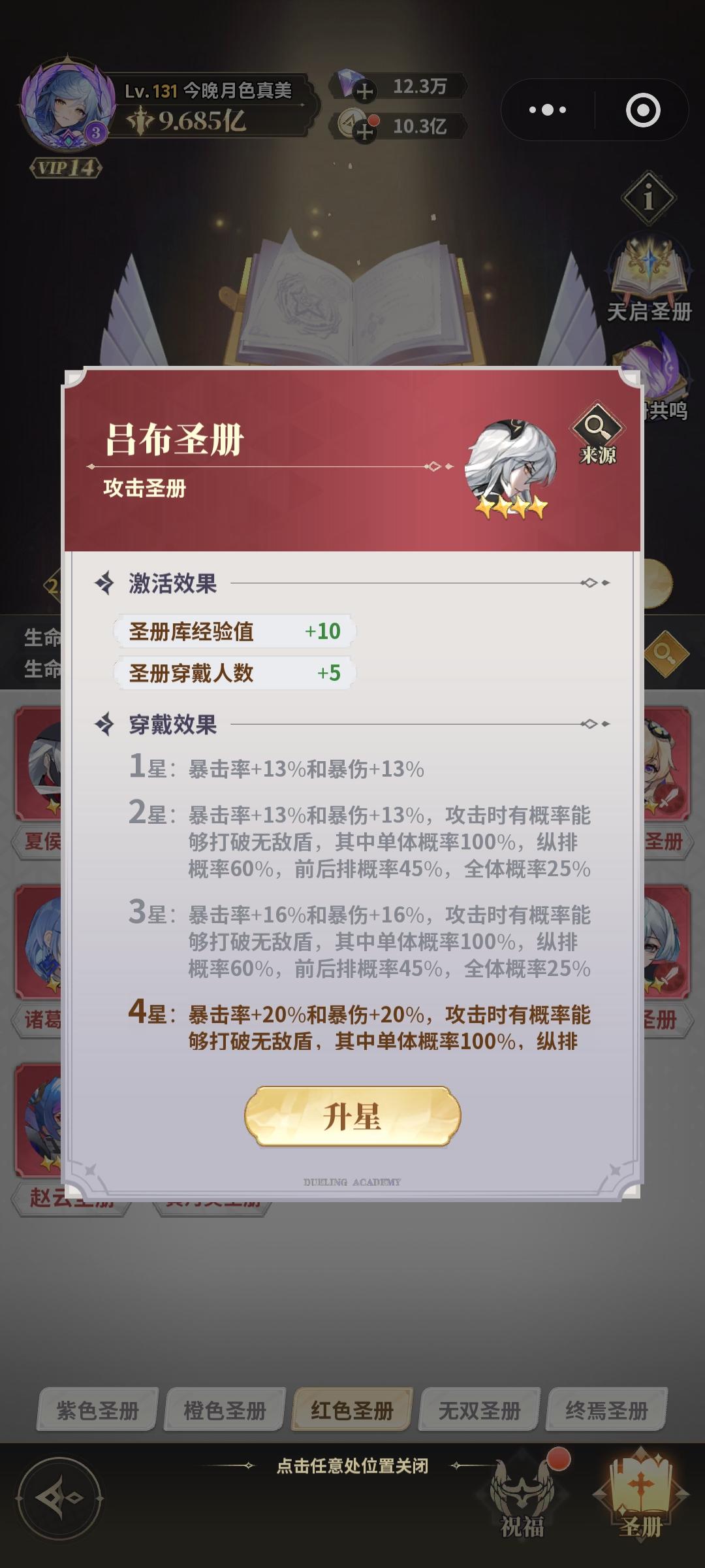 然后就是红色圣册,都有用但是我们获取相对较少所以我们要有个先后顺序,首先重要的是吕布册子,大多数情况大家手上都有一个俩个的无敌盾角色非常影响我们输出所以我们一点要弄