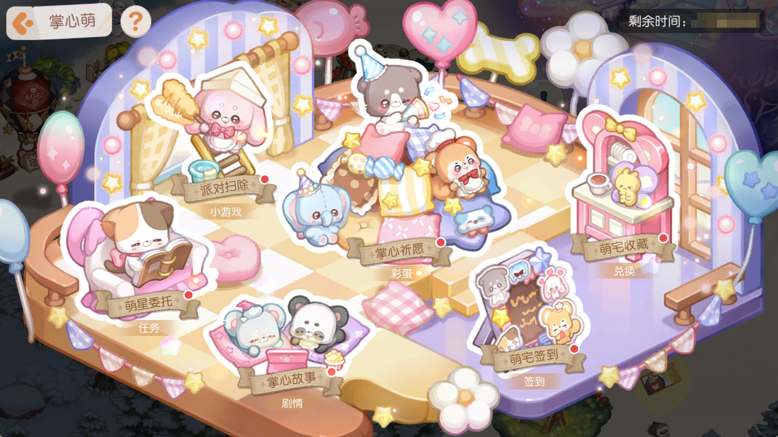 活动介绍:主题彩蛋「掌心祈愿」限时登场!彩蛋上新送福利!新彩蛋上线后可免费抽取一次,首次使用时空之钥和晶钻抽取10连还可分别享受首次8折优惠!彩蛋奖励包含晨星品质时装「小狗噗噗套装」「小兔妮妮套装」以及晨星品质家具套装「动物派对」系列等全新礼物!还有典藏品质的「熊猫潘潘套装」「小猫茉茉套装」和家具「甜蜜小猫面包店」系列,装扮单品「妮妮的蛋糕帽」「妮妮的枕头飘窗」「噗噗的收纳车」「噗噗的漫画角」等限时奖励哦!