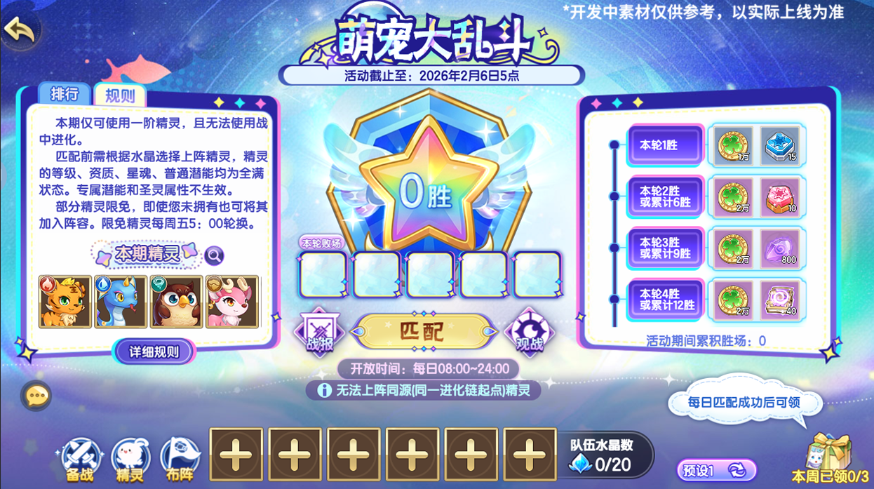 新一期锦标赛上线,本期锦标赛为萌宠大乱斗,主要都是一阶的精灵进行大乱斗哦。在有限的水晶之力下合理构筑阵容,成为决斗之王吧!