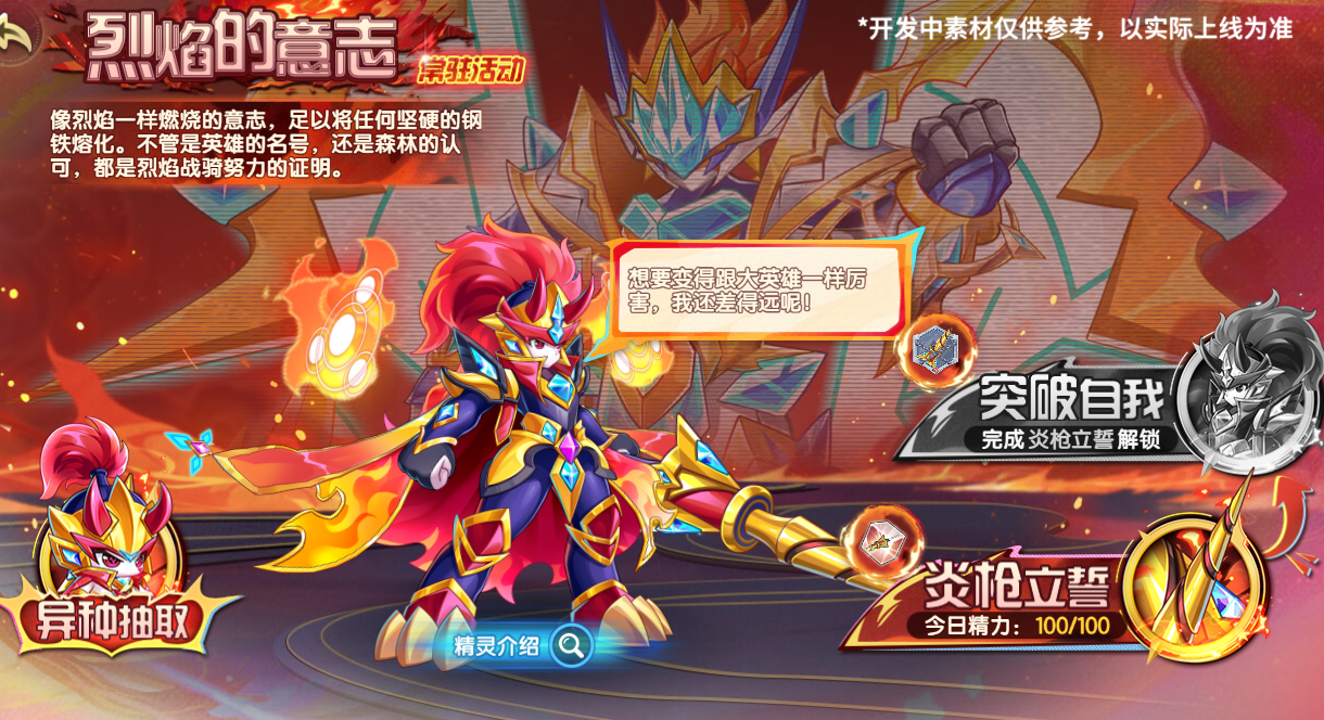 燃烧烈焰般的炽热意志,与炎萌萌一同对炎枪立下坚定誓言!一路披荆斩棘突破自我极限,朝着进化为烈焰战骑的目标全力冲刺。这条蜕变之路上,象征荣耀的英雄名号、代表肯定的森林认可,都将成为烈焰战骑砥砺前行的最佳证明!