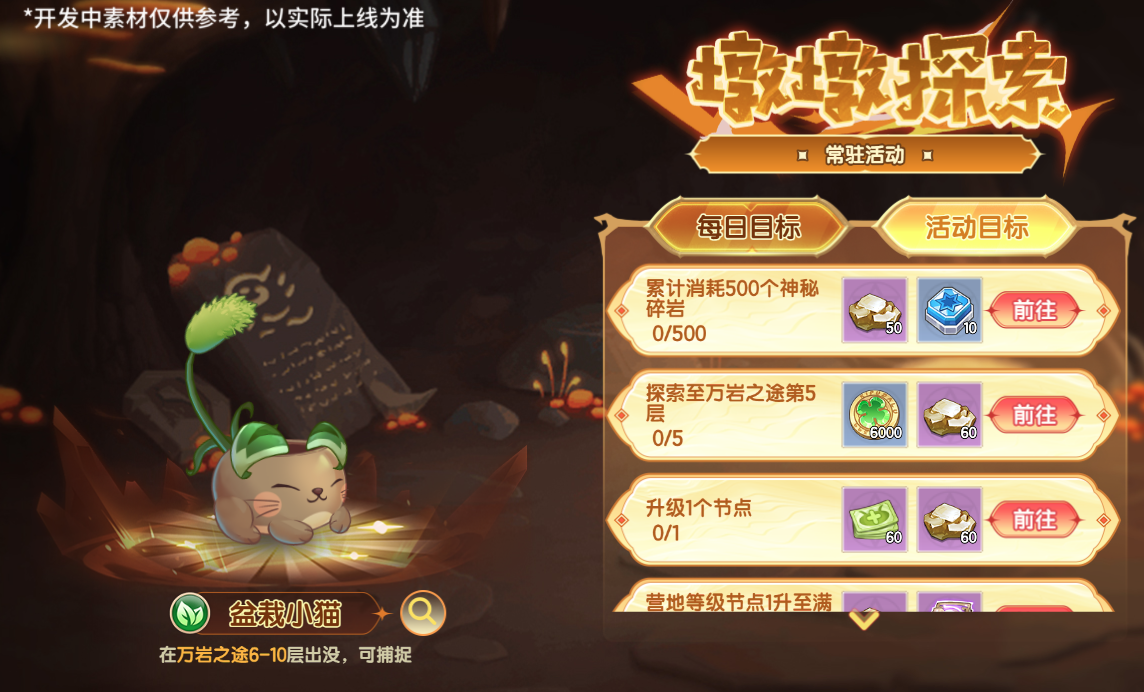 2、常驻活动开启:墩墩探索活动常驻开放,完成每日任务,轻松获得神秘碎岩,提升营地等级。