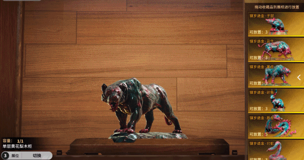 若能有幸得到传闻中的诡金十二生肖,还可以将其放入到展览柜中,据说这些与幽都-鸿雅洞之中产出的生肖,不光会散发出独特的诡城气息,更能保佑在幽都-鸿雅洞内顺风顺水,一身邪骨不沾灾!