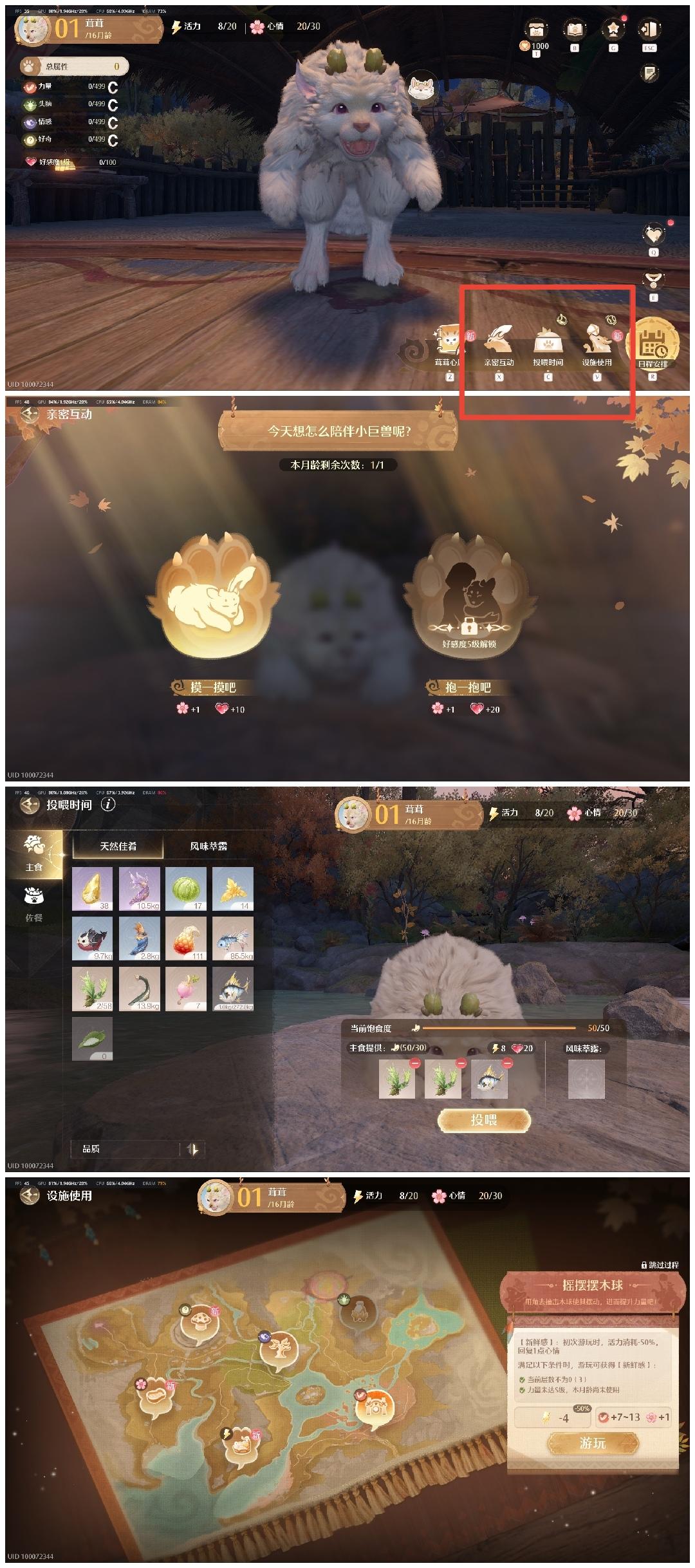 ①巨兽总共有16个月龄,每个月龄都要先亲密互动,投喂和设施使用。睡觉和洗澡加活力值,亲密互动加亲密值,投喂时间加饱食度。其他的设施使用消耗活力获取属性值。