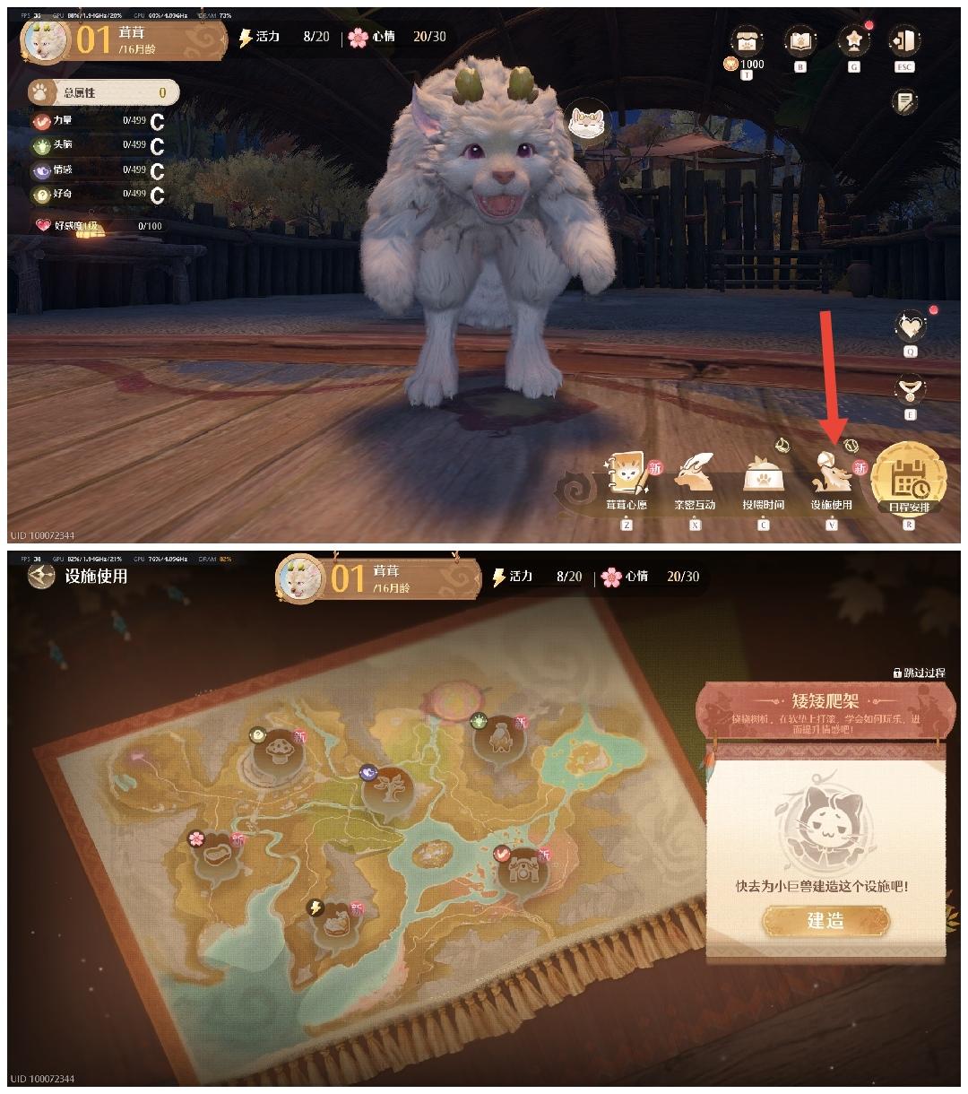设施邀请游玩的时候需要按下面的笛子形状的按钮召唤巨兽,使用完设施以后可以和巨兽对话从“设施使用"点击整理和跳过过程。