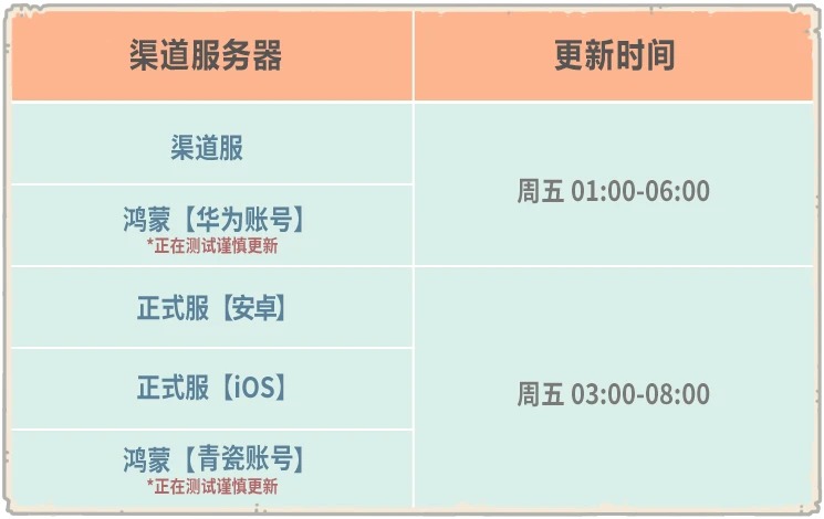 我们预计在本周五(01月09日)对服务器进行停机维护,为了确保版本稳定性,我们将错开不同渠道服务器的更新时间,本次正式服各渠道更新时间如下: